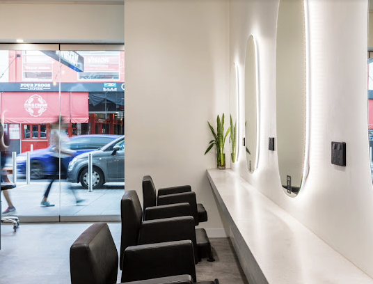 The space was originally a display suite for a nearby apartment development, requiring thoughtful remodelling and spatial reconfiguration to meet the needs of a busy salon environment.