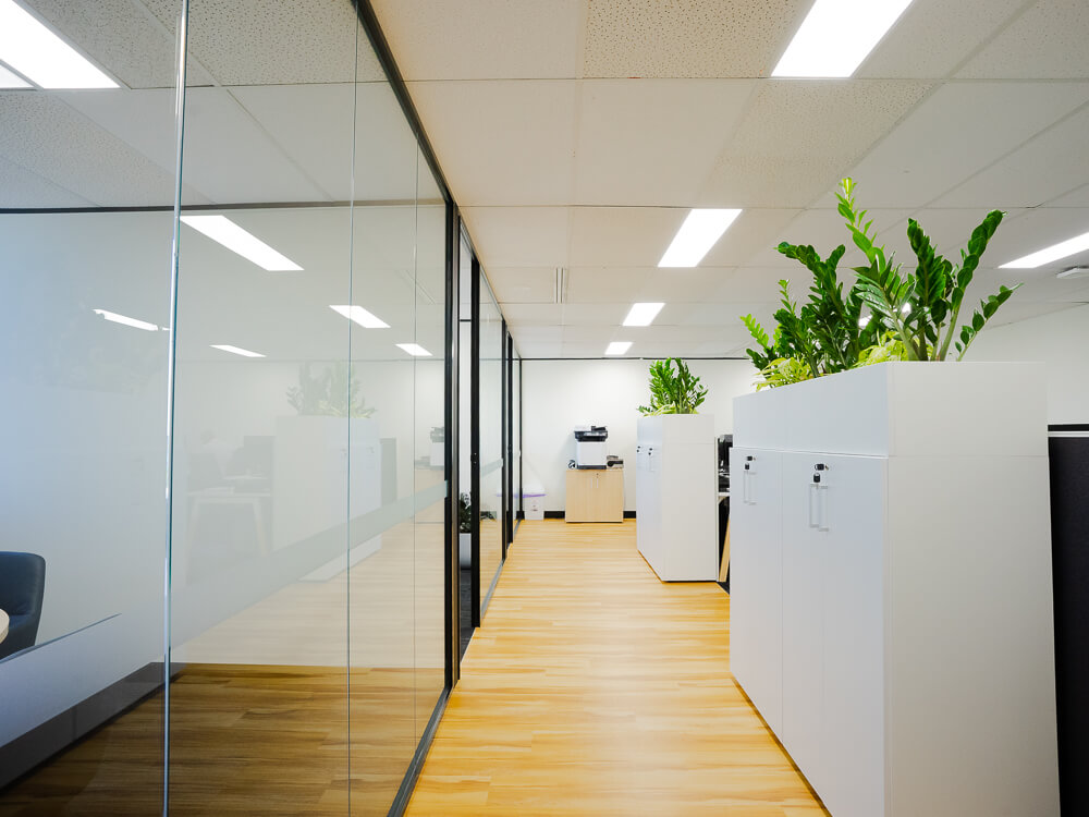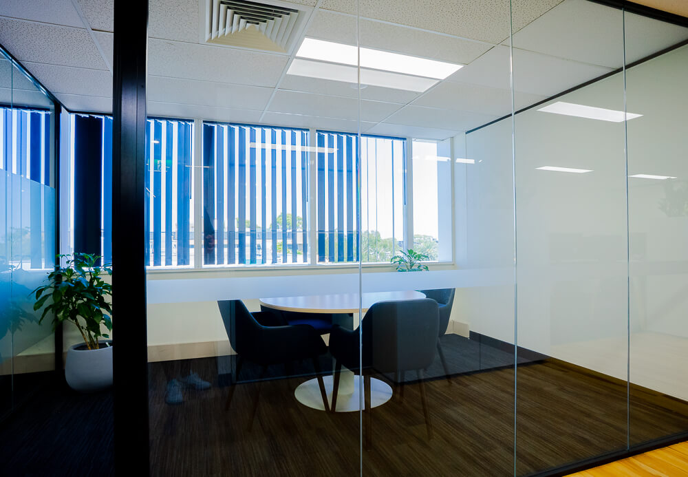 The design concept balances transparency, warmth and performance. Full-height glass partitions and glazed office fronts were installed to maximise natural light flow and create visual connectivity throughout the workspace. At the same time, carefully engineered acoustic treatments and soundproofing ensure confidential conversations remain private — a critical requirement for an accounting and advisory firm.