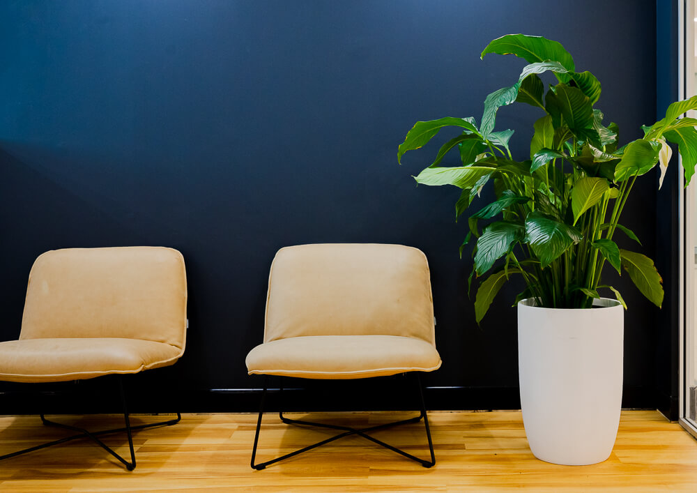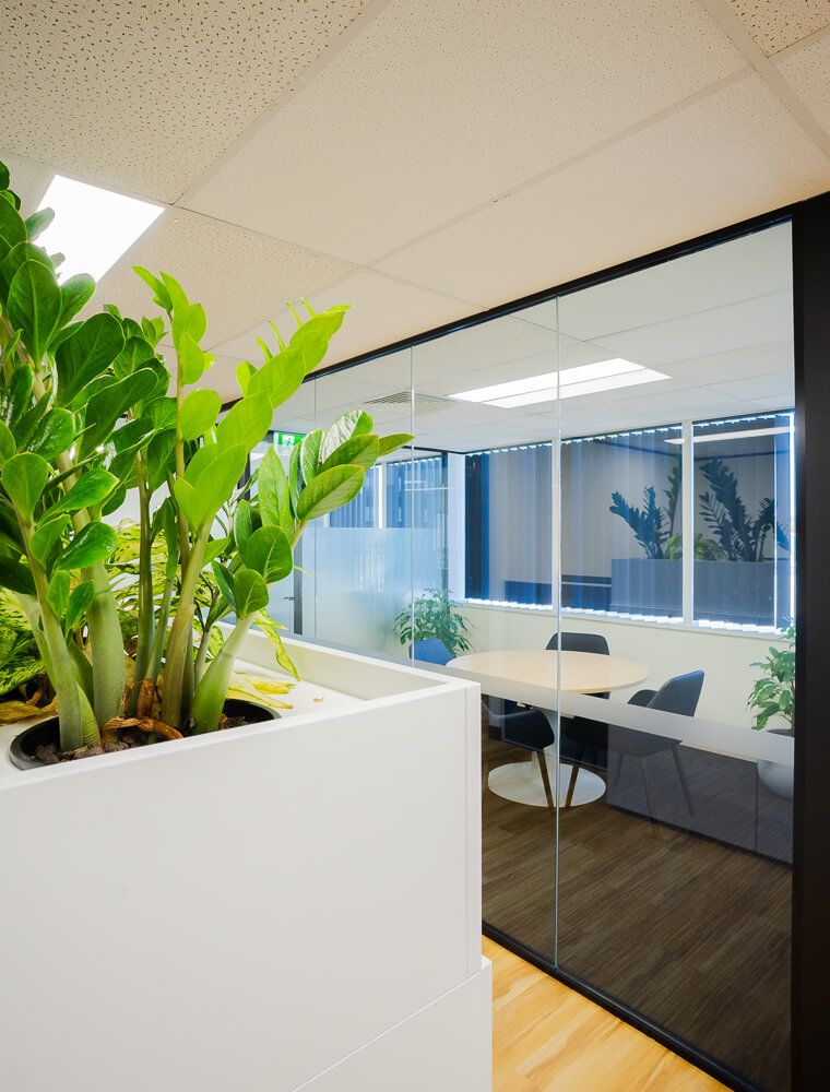 Biophilic elements were integrated throughout custom joinery and shelving. Built-in greenery softens the architectural lines, improves air quality and enhances employee wellbeing. Subtle pops of green reinforce the brand identity and create a more energised and natural work environment — proven to support productivity and workplace satisfaction.